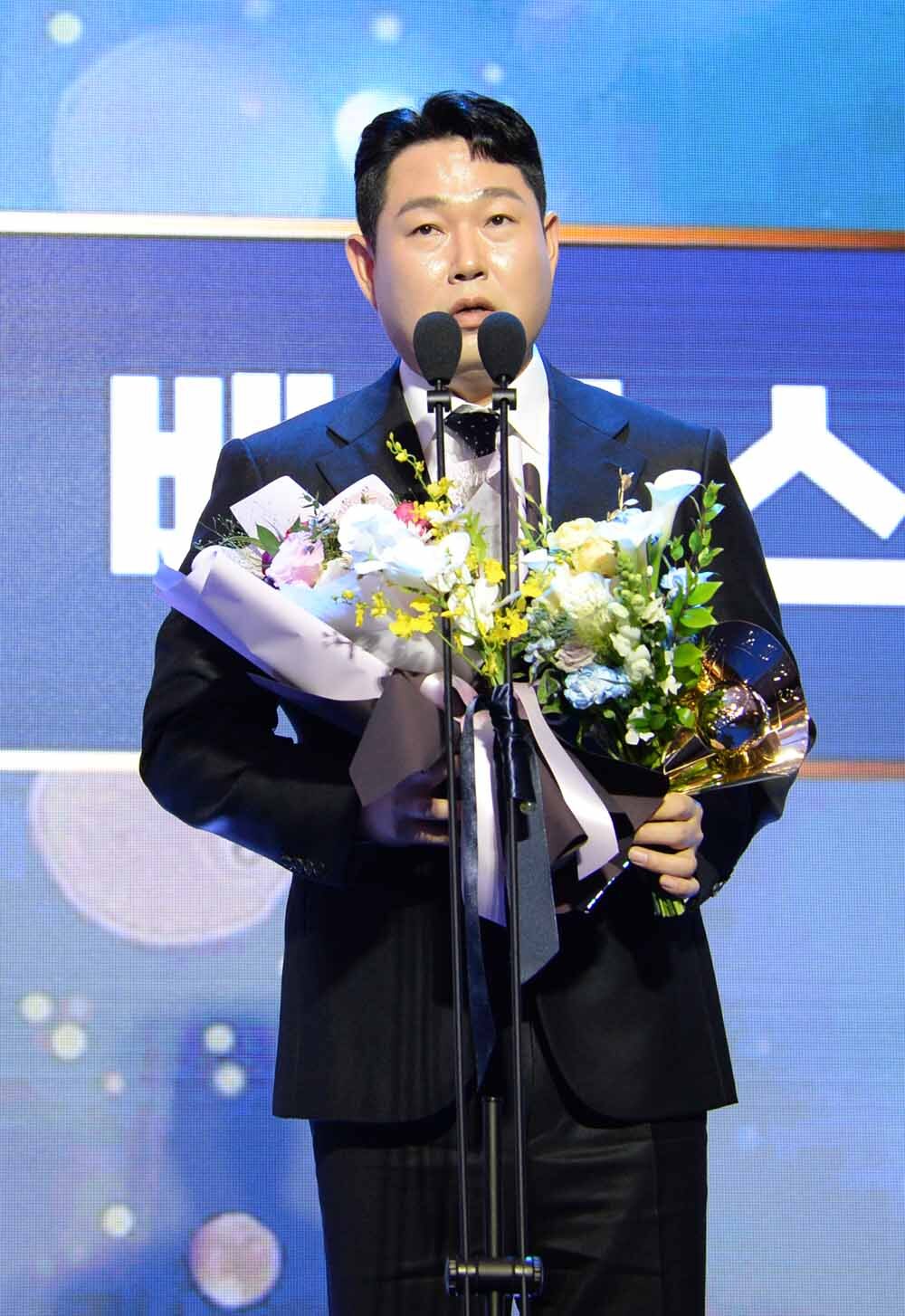 프로야구 두산 양의지가 24일 서울 송파구 잠실 롯데호텔 월드 크리스탈볼룸에서 열린 '2025 신한 SOL뱅크 KBO 시상식'에서 타율상을 수상한 뒤 소감을 발표하고 있다. 사진=김두홍 기자 kimdh@sportsworldi.com