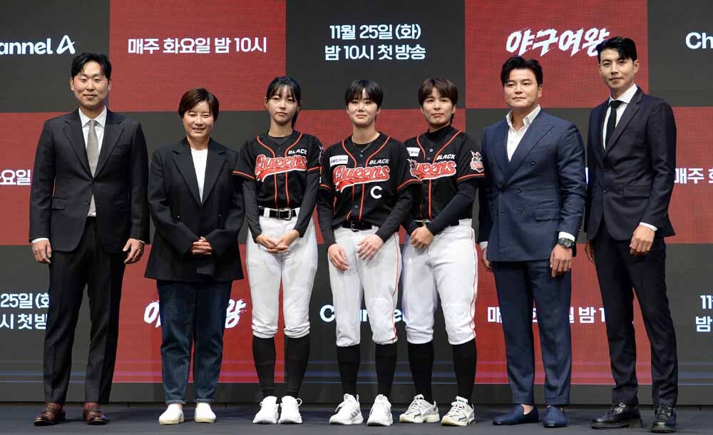 윤석민, 박세리, 김민지, 김온아, 김성연, 추신수, 이대형(왼쪽부터)이 25일 서울 구로구 더세인트 신도림에서 열린 채널A '야구여왕' 제작발표회에서 포즈를 취하고 있다. 채널A '야구여왕'은 각기 다른 스포츠 종목에서 활약한 레전드 여성 선출들이 ‘야구’라는 낯선 무대에 도전장을 내미는 스포츠 예능으로, ‘블랙퀸즈’의 단감코와 선수들이 ‘여자 야구 전국대회 우승’을 목표로 박세리, 추신수, 윤석민, 이대형, 김민지, 김성연, 김온아 등이 출연한다. 사진=김두홍 기자 kimdh@sportsworldi.com