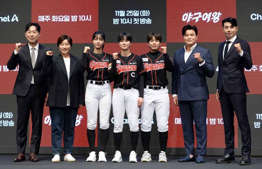 윤석민, 박세리, 김민지, 김온아, 김성연, 추신수, 이대형(왼쪽부터)이 25일 서울 구로구 더세인트 신도림에서 열린 채널A '야구여왕' 제작발표회에서 포즈를 취하고 있다. 채널A '야구여왕'은 각기 다른 스포츠 종목에서 활약한 레전드 여성 선출들이 ‘야구’라는 낯선 무대에 도전장을 내미는 스포츠 예능으로, ‘블랙퀸즈’의 단감코와 선수들이 ‘여자 야구 전국대회 우승’을 목표로 박세리, 추신수, 윤석민, 이대형, 김민지, 김성연, 김온아 등이 출연한다. 사진=김두홍 기자 kimdh@sportsworldi.com