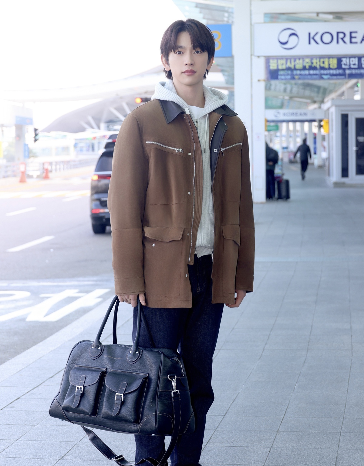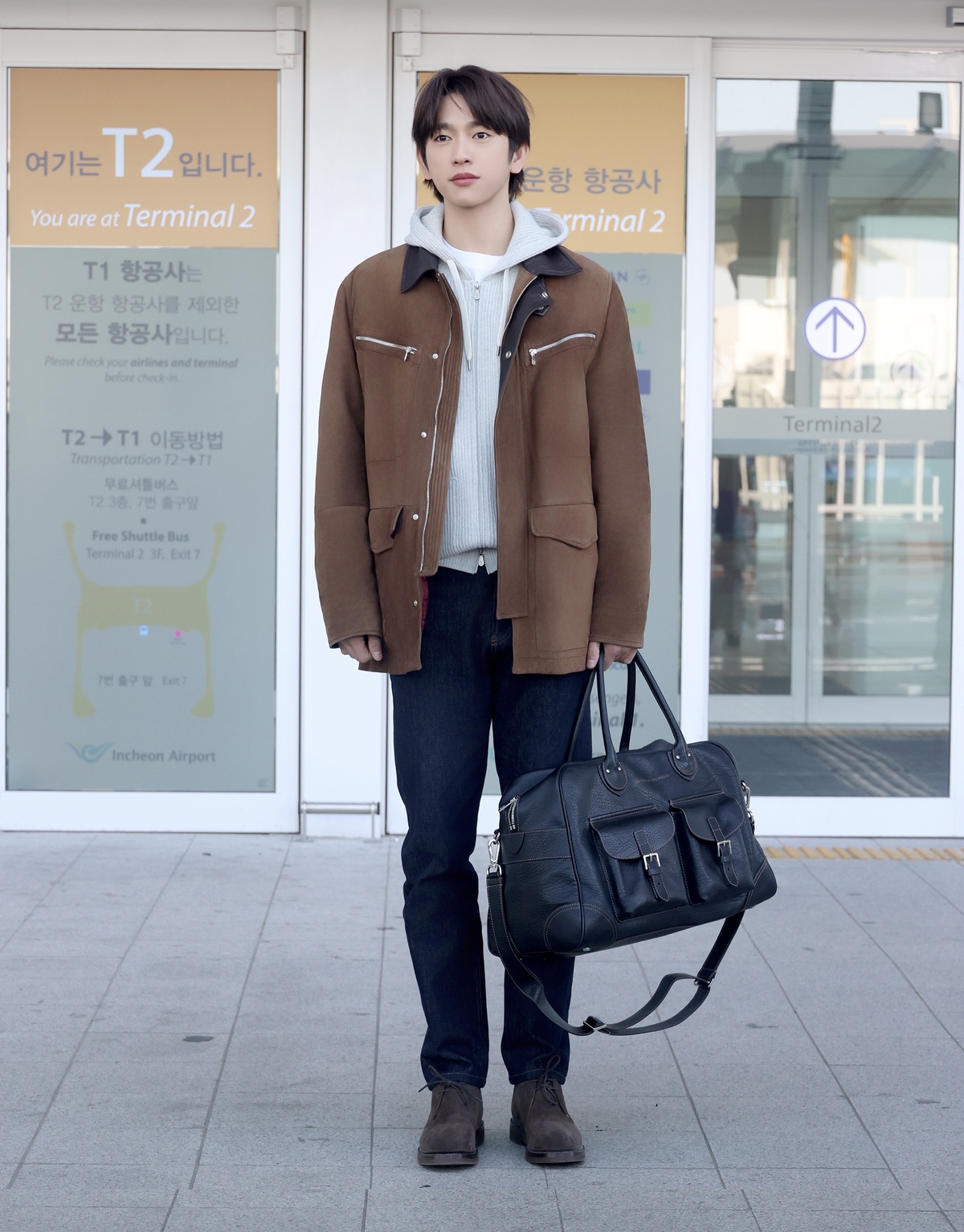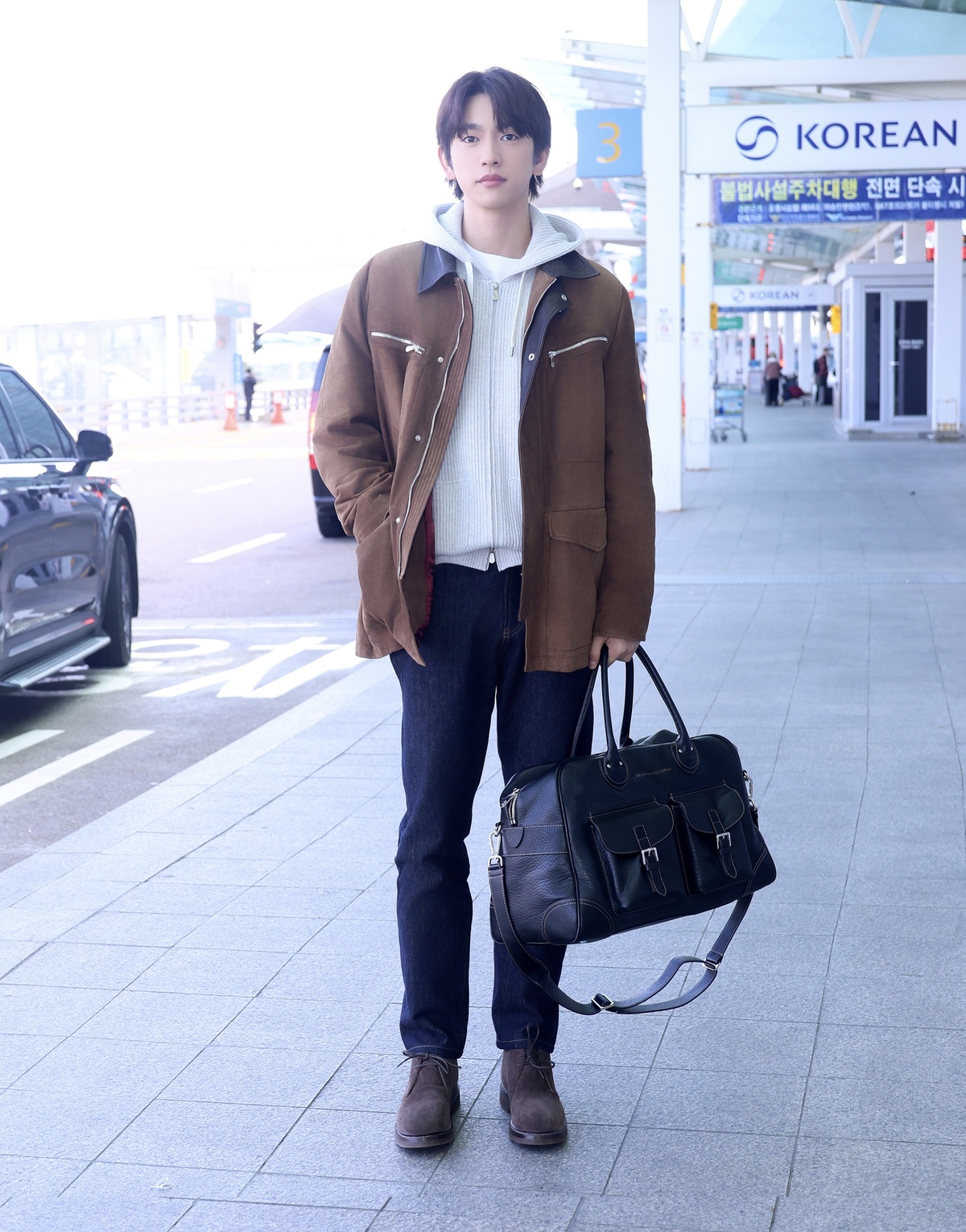 이날 박진영은 부드러운 브라운 톤이 돋보이는 스웨이드 재킷에 그레이 니트 집업 후디와 짙은 생지 데님을 매치해 편안하면서도 감각적인 캐주얼 룩을 선보였다. 자연스러운 텍스처가 살아있는 스웨이드 재킷은 전체적인 스타일에 고급스러운 무드를 더했으며, 라이트 그레이 컬러의 후디는 박진영 특유의 부드러운 분위기를 강조시켰다. 또, 톤온톤으로 매치한 브라운 스웨이드 부츠와 위켄더백이 실용적이면서도 정돈된 스타일링을 완성하며 시선을 끌었다. 과한 디테일 없이도 깔끔한 실루엣과 안정적인 컬러 조합으로 완성된 그의 공항패션은 ‘데일리 공항룩’의 기준을 제시했다.